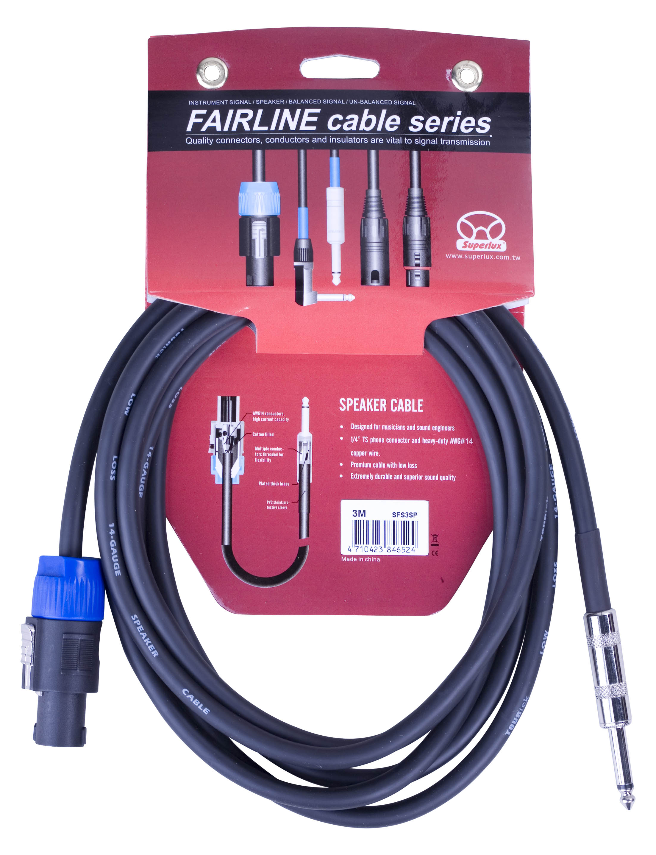 Superlux SFS3SP - колоночный кабель (калибр AWG#14) с разъемами speakON и 6,3 мм джек (прямой, моно), длина 3 м.