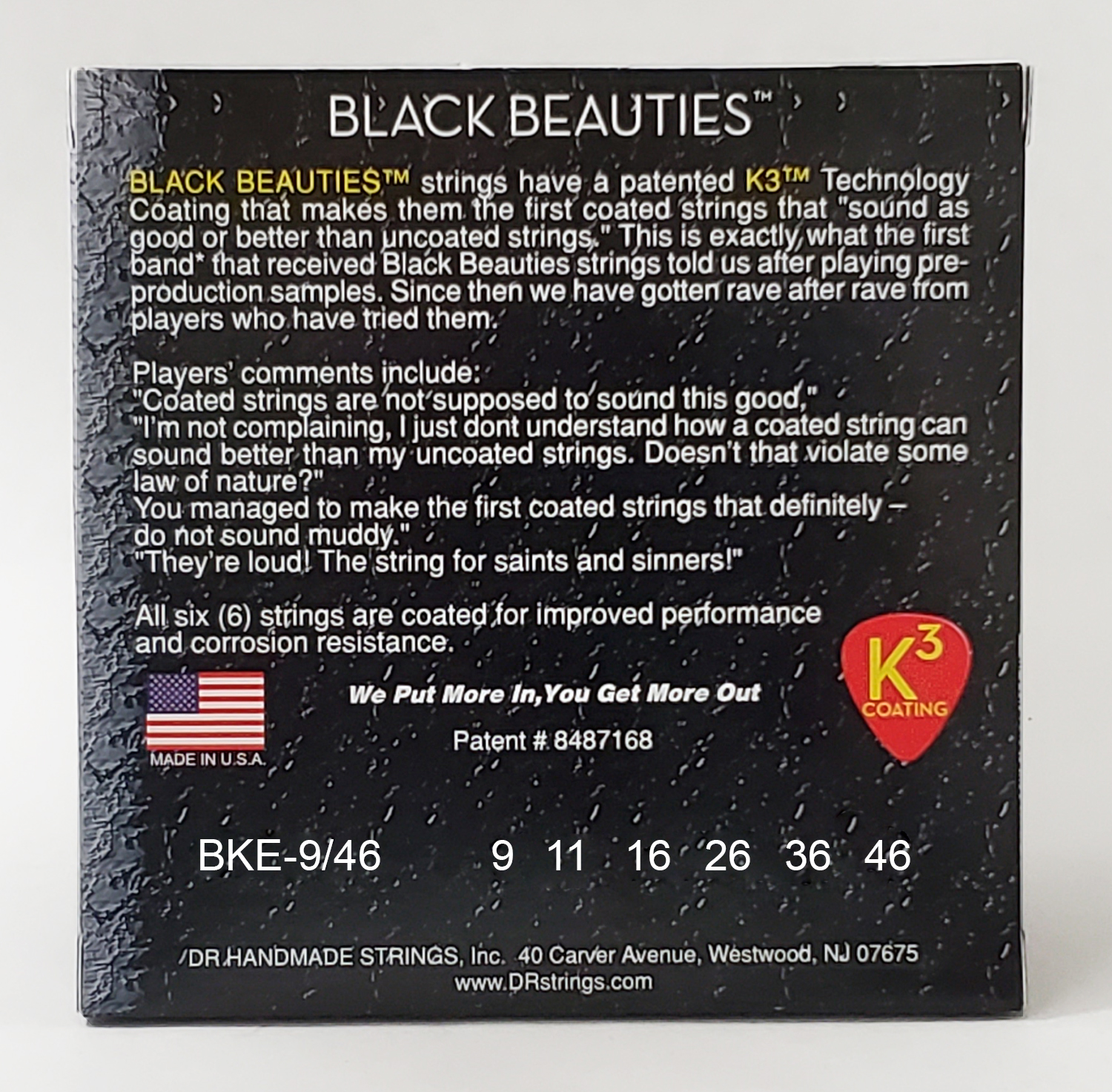 Серия DR Black Beauties – это струны для электрогитар с обмоткой из никелированной стали на шестигранном сердечнике и черной оболочкой, нанесенной по патентованной технологии K3™. Струны с защитной оболочкой K3 звучат и ощущаются так же, если не лучше, чем обычные струны без оболочки, что подтверждается отзывами гитаристов по всему миру. Гитаристы отмечают высокую громкость этих струн, отсутствие нежелательных обертонов, повышенную чистоту и артикуляцию по сравнению с обычными струнами. И в тоже время, благодаря патентованной защите K3, они обладают повышенной устойчивостью к коррозии и перспирации, что значительно продлевает их срок службы.
