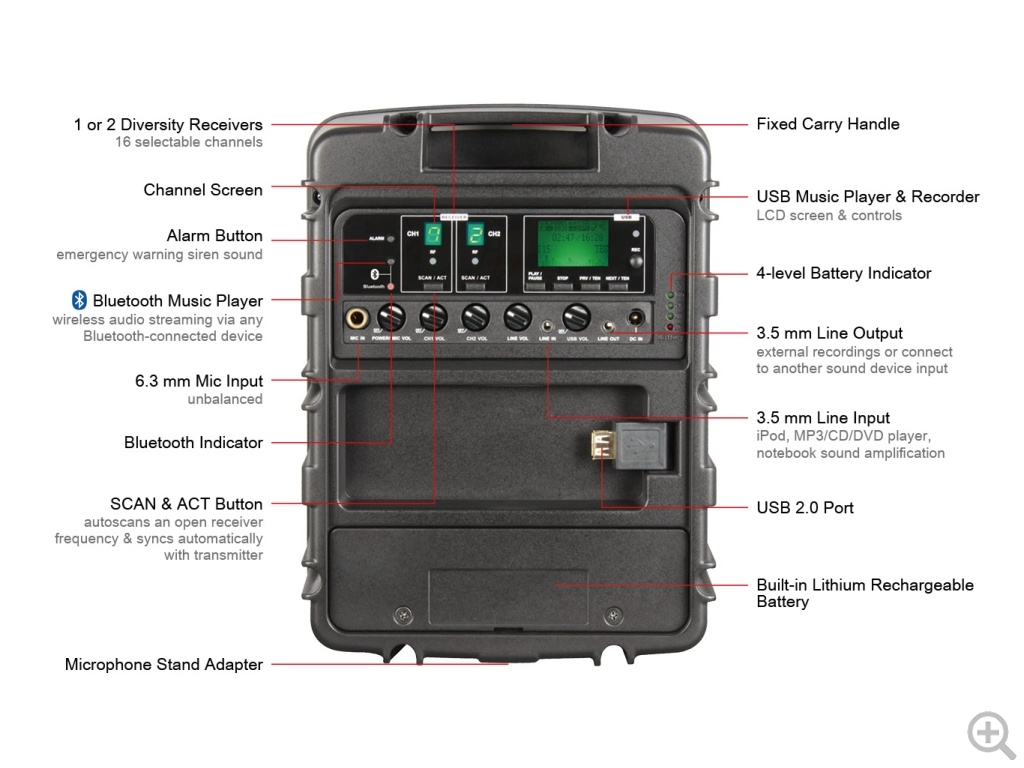 Идеально подходит для оповещения при небольшом и среднем скоплении людей, таких как для школы, культурные мероприятия, корпоративное обучение, выставки, уличные перфомансы, фитнес-инструктаж, и в других аналогичных ситуациях.
