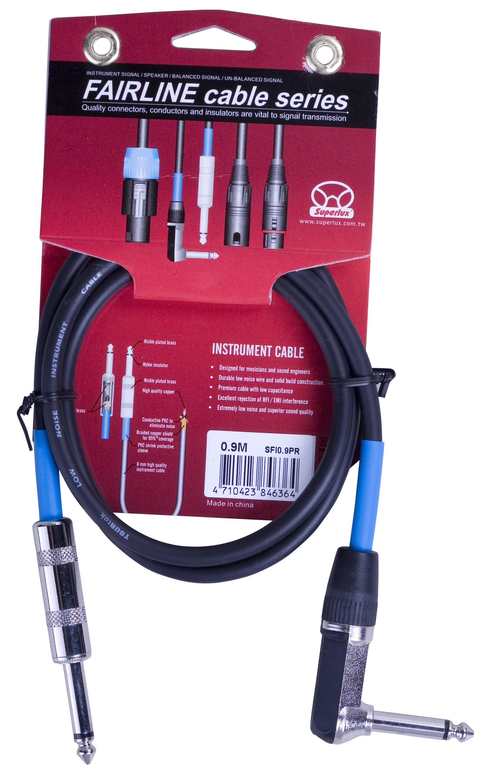 Superlux SFI0.9PR - инструментальный кабель (калибр AWG#24) с разъемами 6,3 мм джек (прямой, моно) - 6,3 мм джек (угловой, моно), длина 0,9 м.