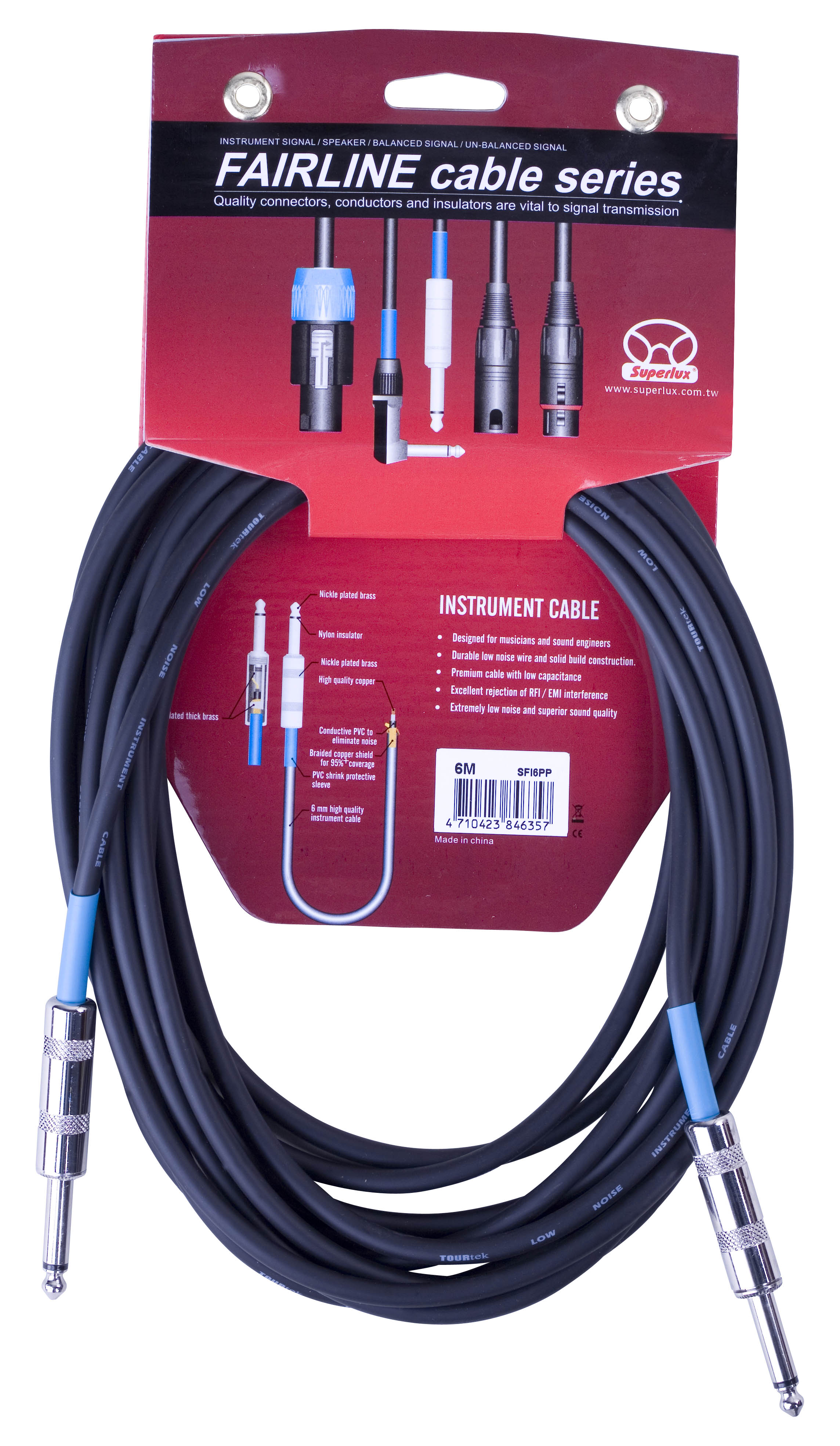 Superlux SFI6PP - инструментальный кабель (калибр AWG#24) с прямыми разъемами 6,3 мм джек (моно), длина 6 м.